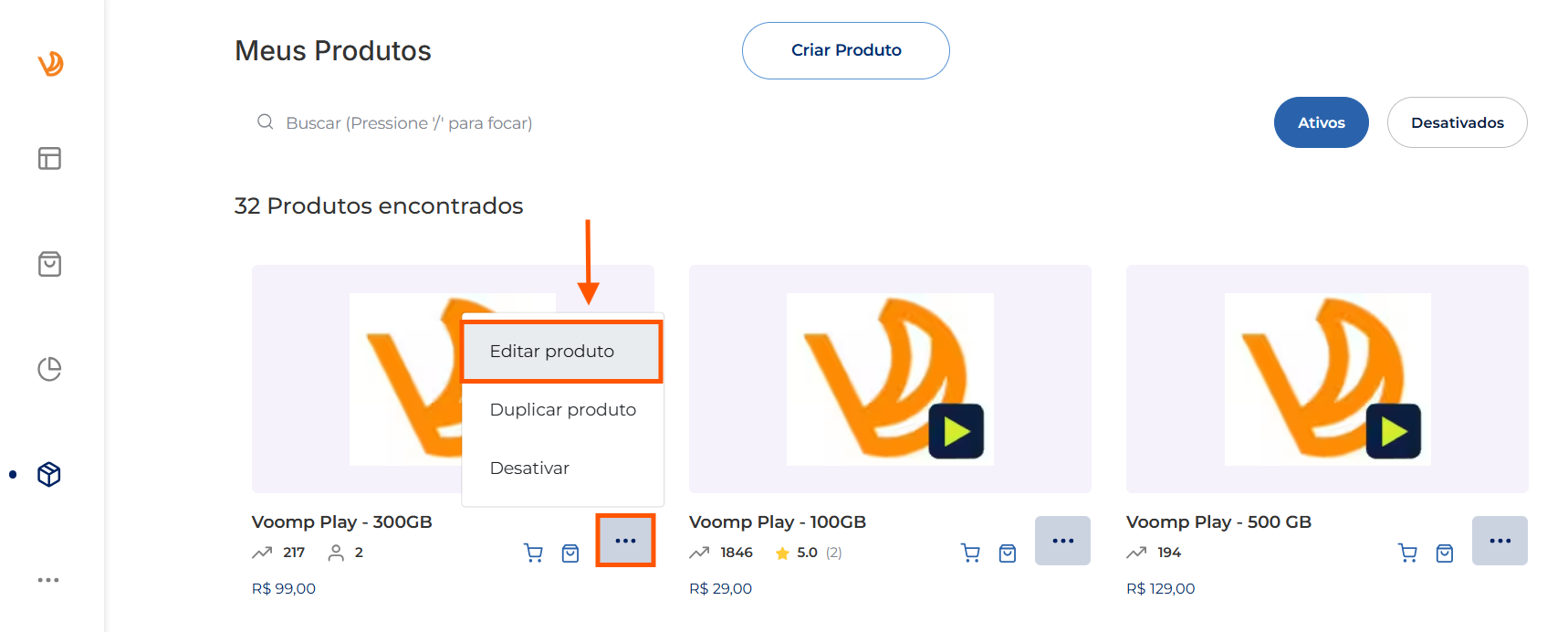 2. Clique no botão de ações referente ao produto que deseja vincular ao Voomp Play e depois em "Editar produto":