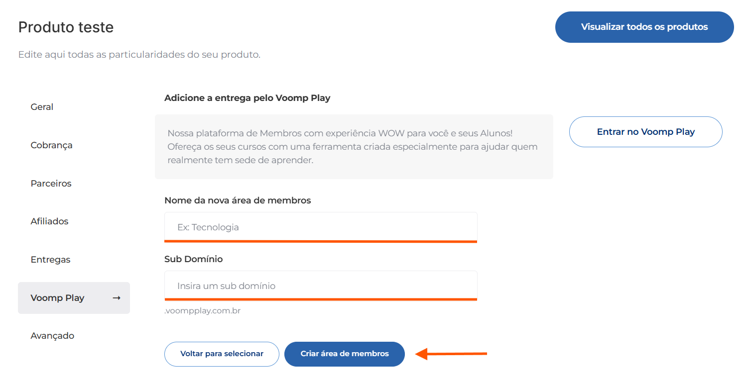 3. Acesse a aba "Voomp Play", adicione um nome para sua área de membros e em seguida um sub domínio. Por último, clique em "Criar área de membros":