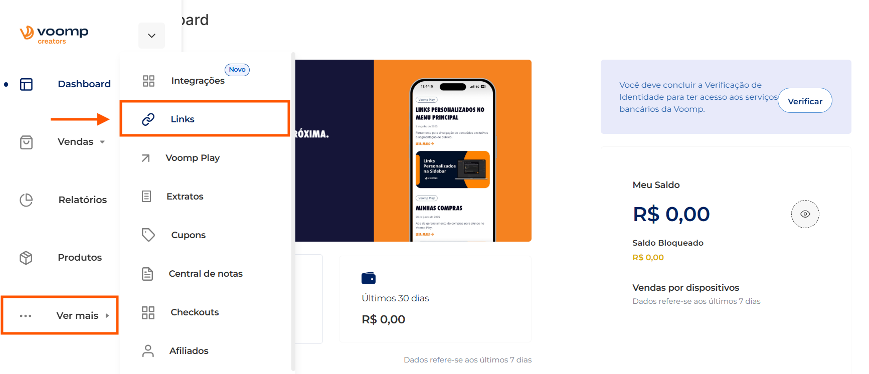 1. Em sua conta Voomp, no menu lateral, acesse "Ver mais" > "Links":