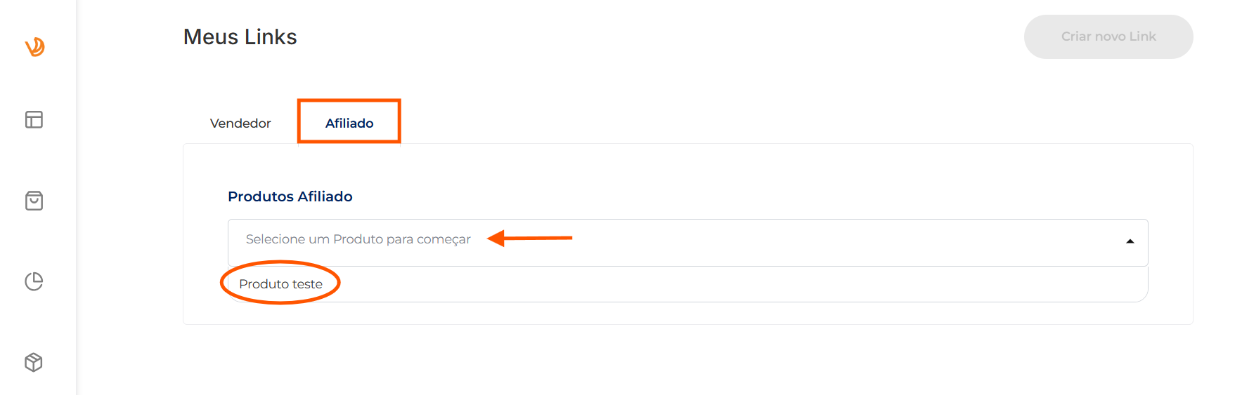 2. Acesse a aba "Afiliado", clique na barra de produtos e selecione o produto qual deseja obter os links de divulgação: