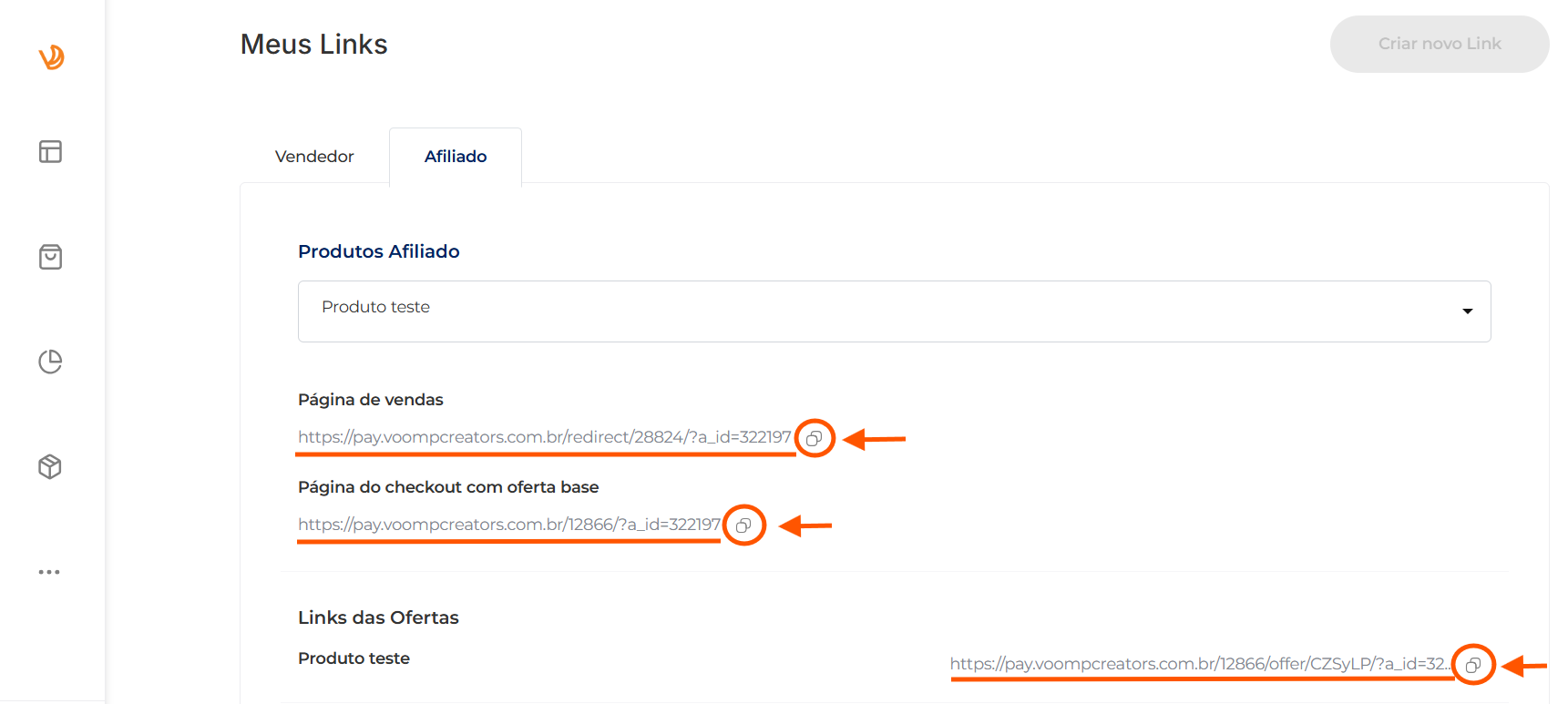 3. Copie o link da página de vendas, página de checkout ou de alguma oferta personalizada, todos estarão com seu código de identificação na URL, gerando comissões a cada venda realizada: