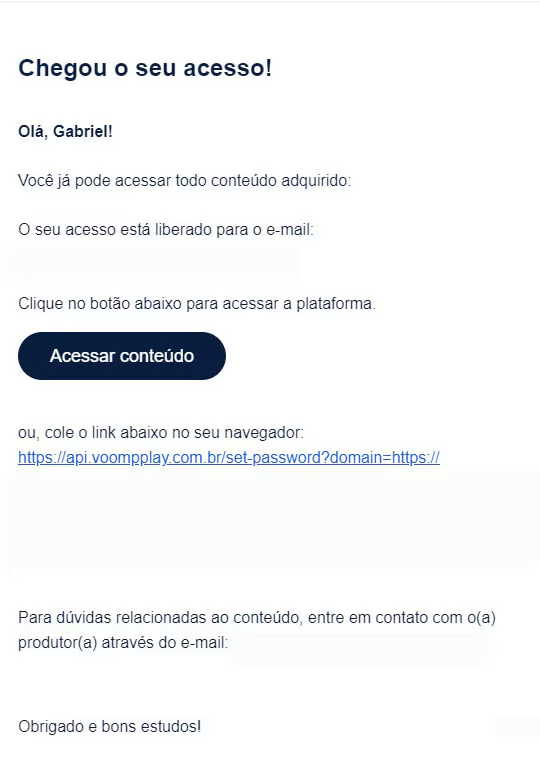 - Sempre que você faz a compra de um produto que está hospedado na Voomp, um e-mail é enviado com as informações detalhadas.