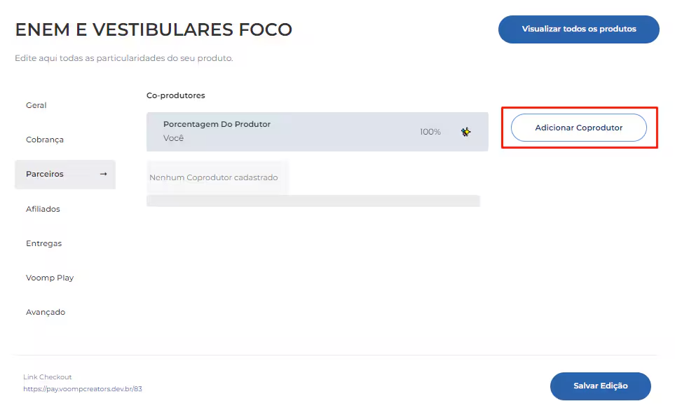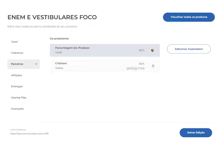 - O coprodutor foi adicionado e agora terá participação nas suas vendas, conforme a forma que você configurou.