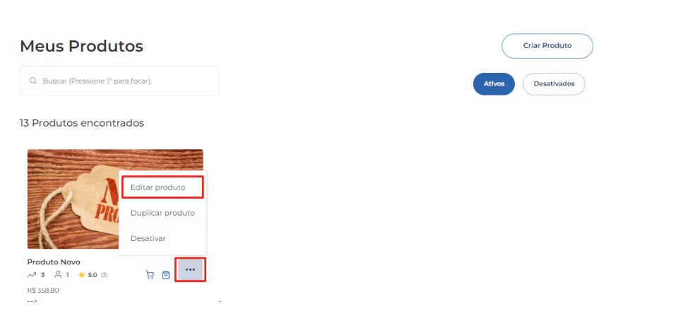 - Localize o produto que você deseja adicionar o coprodutor e entre na edição do mesmo, clicando nos três pontinhos (...) e editar produtos;