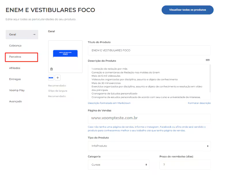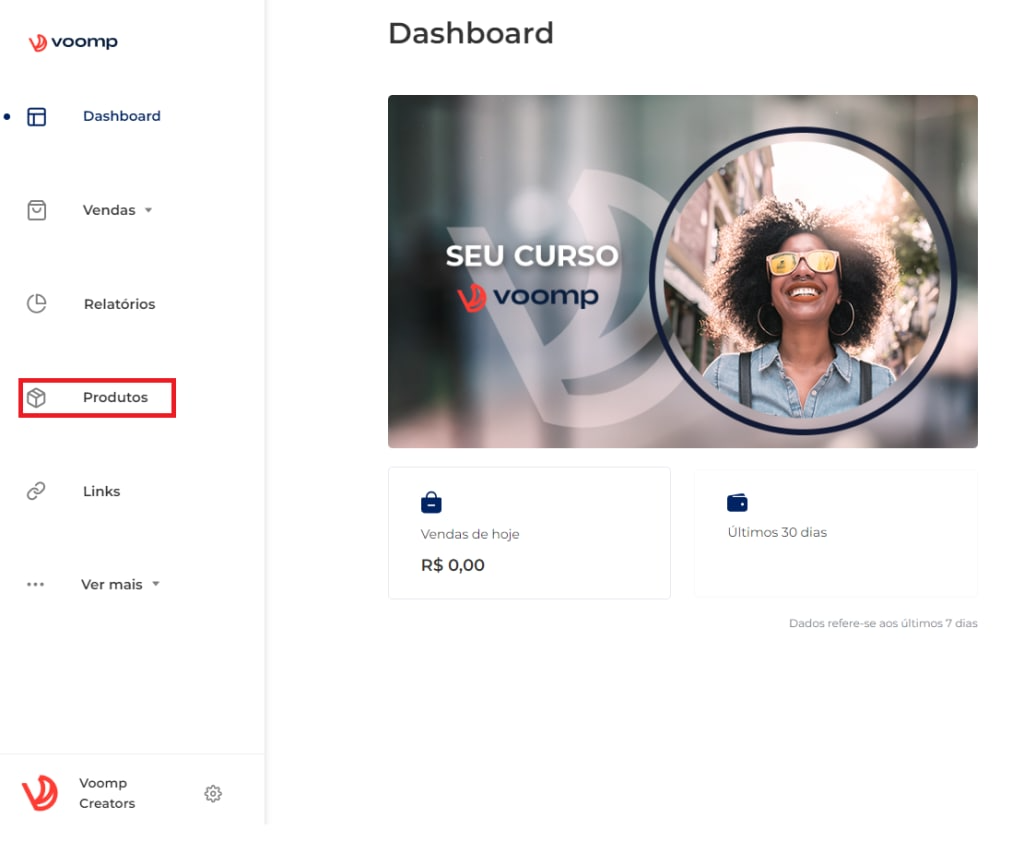 - Entre na sua conta no Voomp Creators, clique na aba produtos;