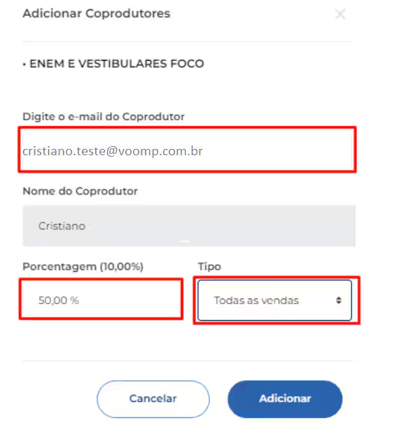 - Digite o e-mail do coprodutor e defina sua porcentagem de comissão, você também poderá escolher em quais vendas o coprodutor receberá essa comissão;