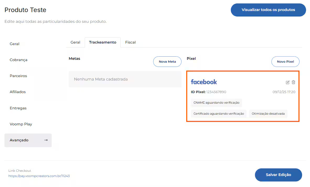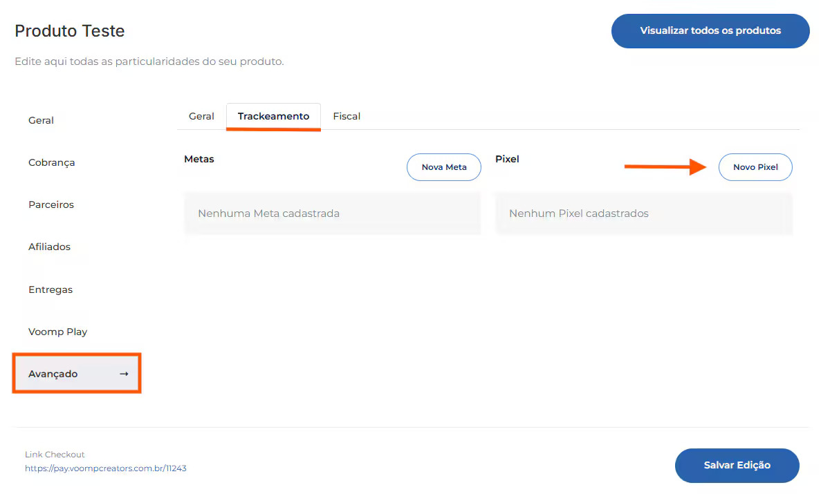 3. Na aba "Avançado", clique em "Trackeamento" e depois em "Novo Pixel":