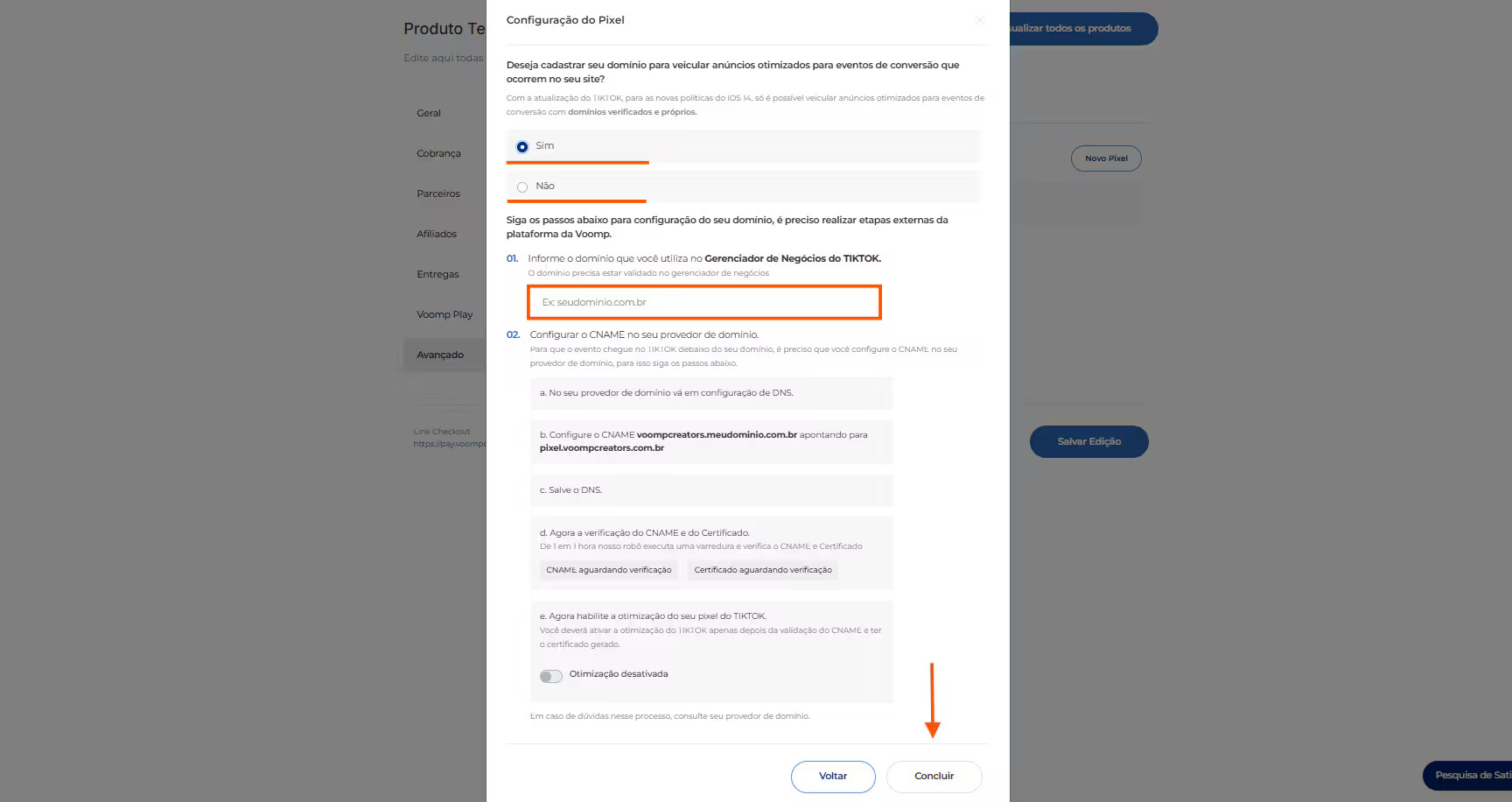 6. Se deseja cadastrar seu domínio para veiculação de anúncios otimizados, selecione a opção "Sim", insira seu domínio no campo indicado e siga as demais instruções listadas na página.