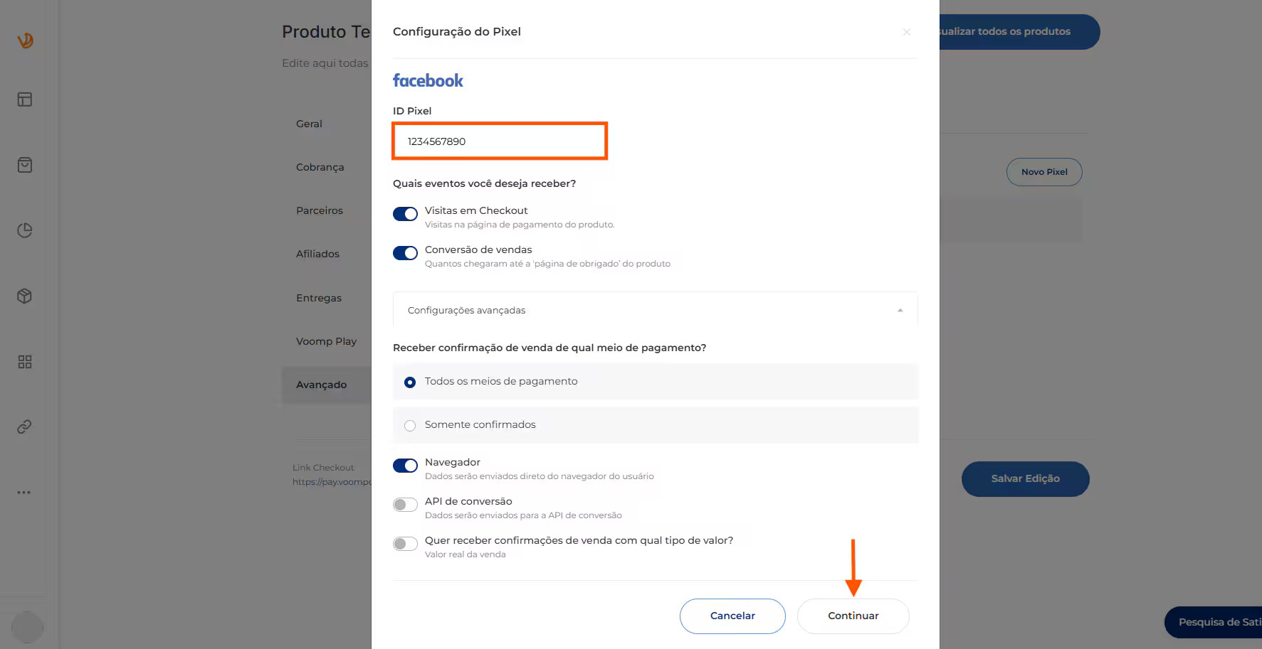 5. Insira o ID do pixel no campo correspondente e habilite as informações que deseja receber. Clique em "Continuar":