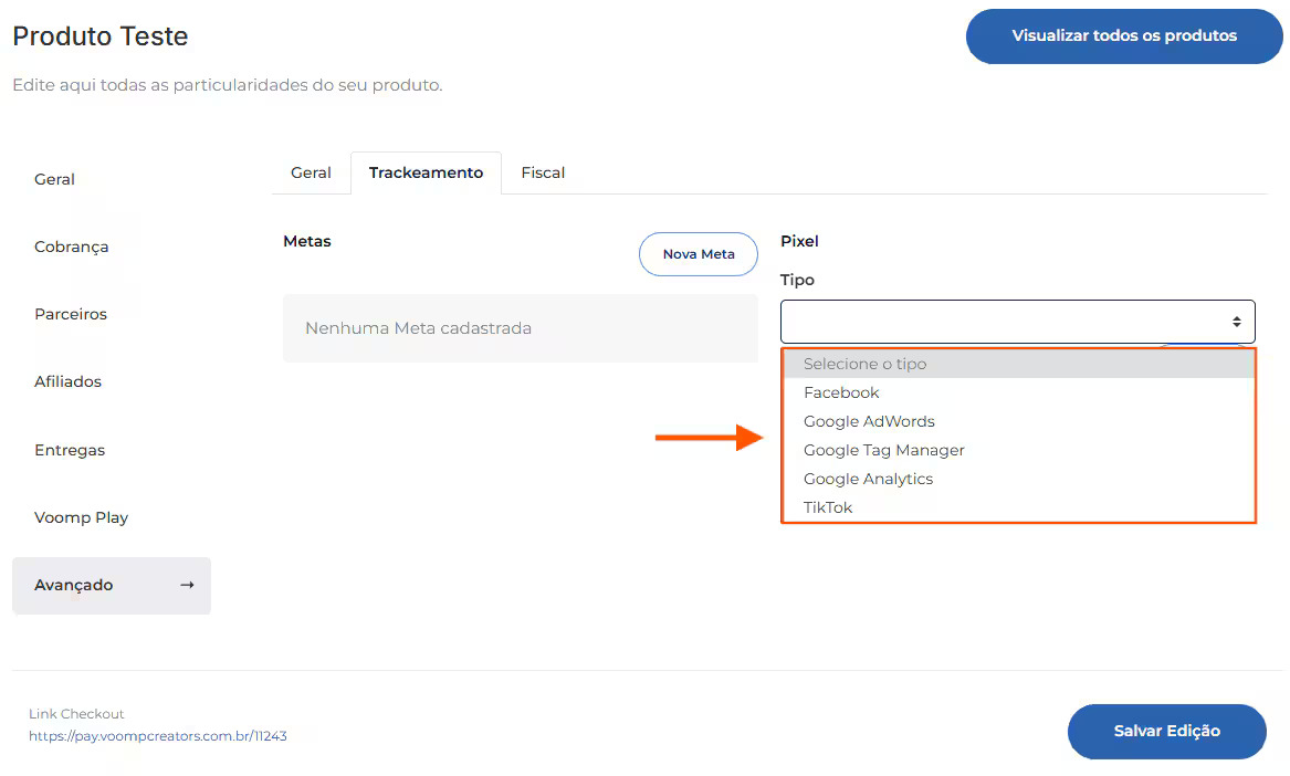 1. Em sua conta Voomp, no menu lateral, acesse "Produtos":