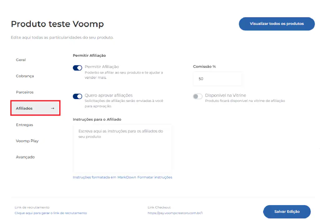- Acesse a opção Afiliados e realize as configurações da maneira que preferir;