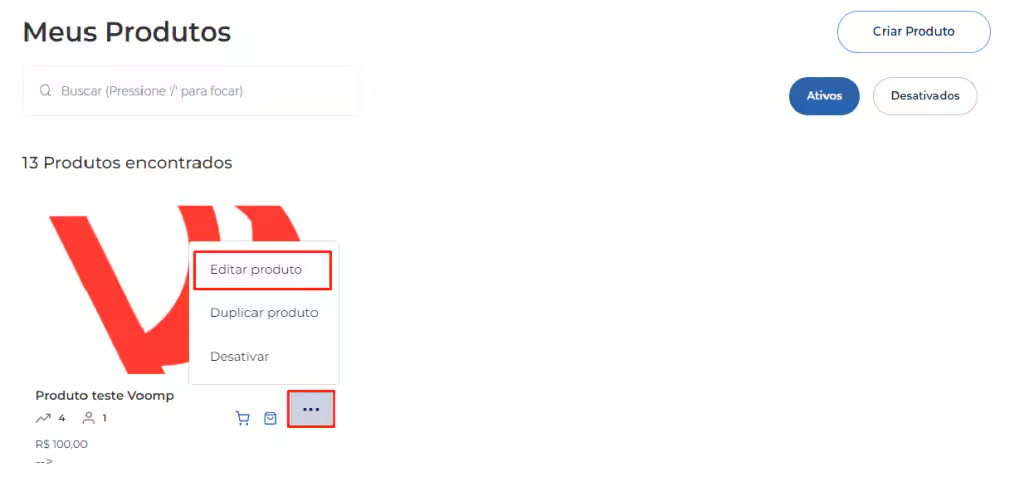 - Clique sobre os três pontinho (…) e Editar Produto.