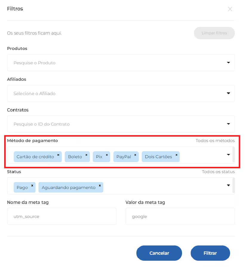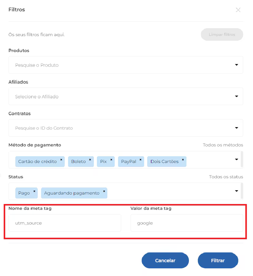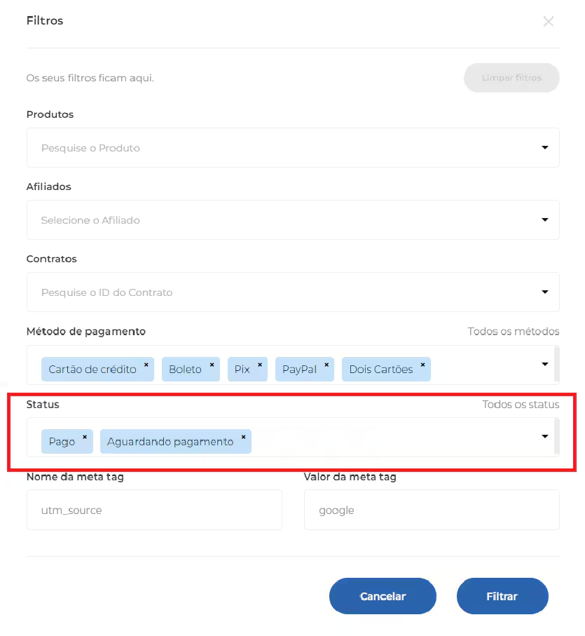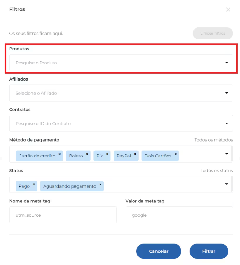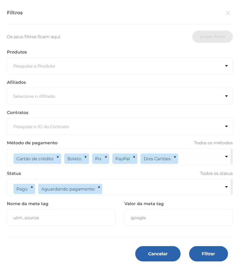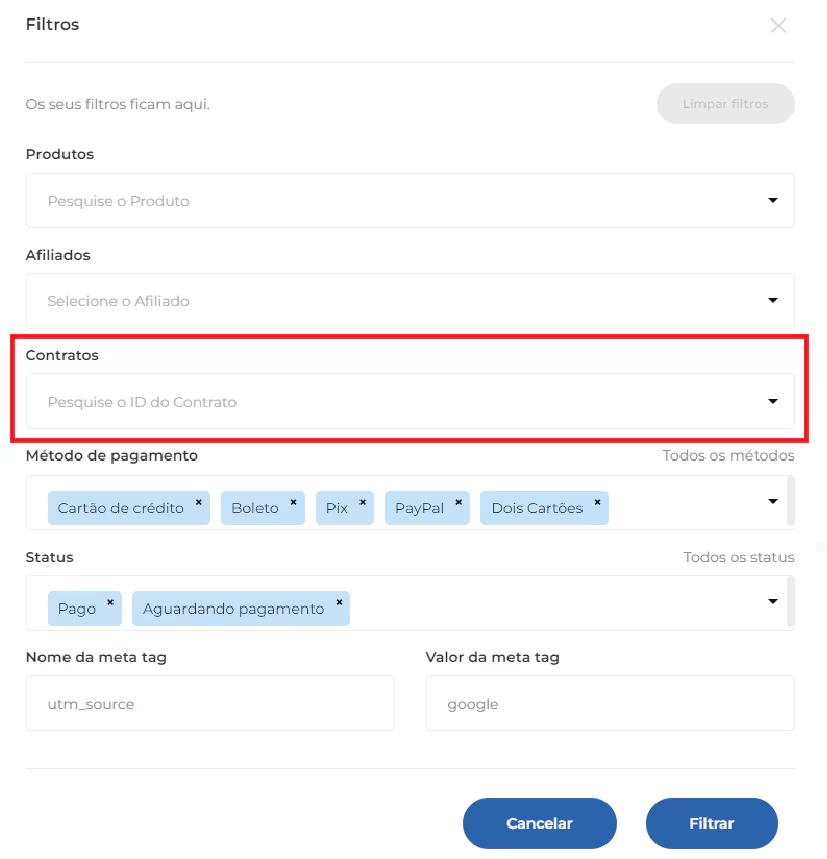 - Selecione as opções desejadas como, por exemplo: Produtos, Contratos, Métodos de Pagamentos, Status e Nome da Tag: