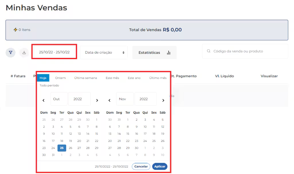 - Filtre suas vendas por períodos, datas específicas e personalizadas: