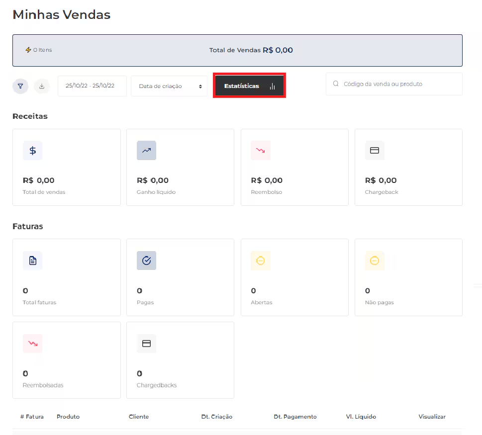 - Ao selecionar a aba estatísticas você conseguirá ter uma visão geral de seu produto: