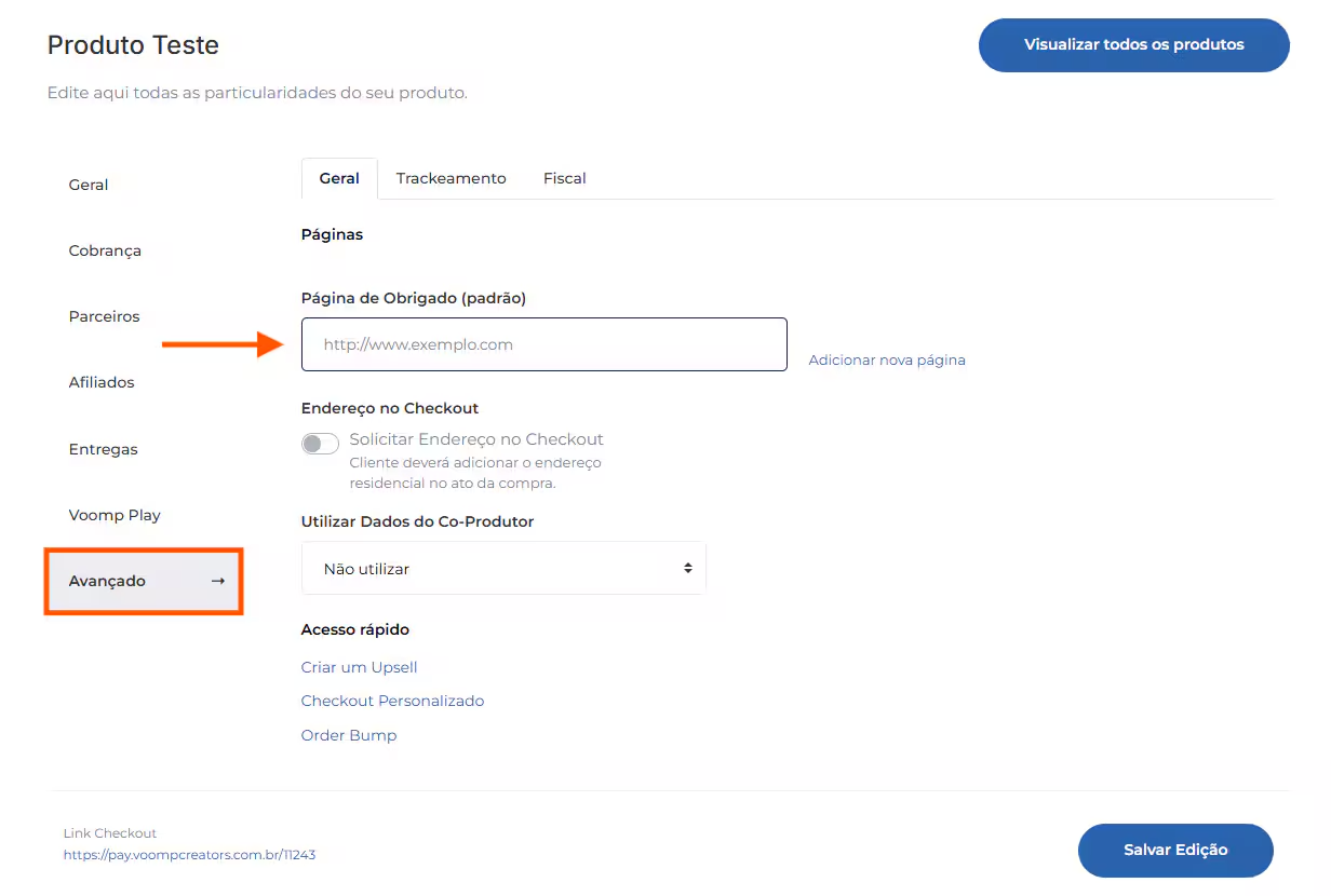 3. Acesse a aba “Avançado” e em “Página de Obrigado (padrão)” insira a URL de sua página: