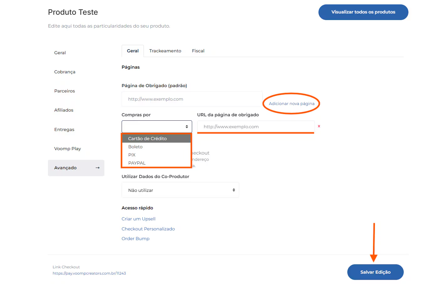 4. Ao clicar na opção “Adicionar nova página”, você consegue adicionar mais de uma página de obrigado específica para cada método de pagamento, seguindo conforme sua estratégia de venda. Selecione o método e depois cole a URL da página.