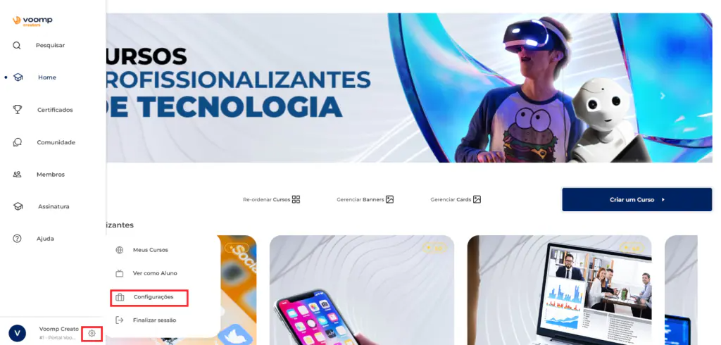 Clique no símbolo da engrenagem, Configurações;