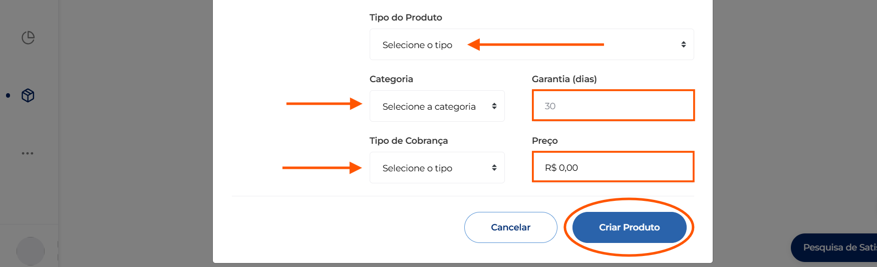 3. Ao abrir a aba "Criação de Produto", você precisará configurar os seguintes campos: