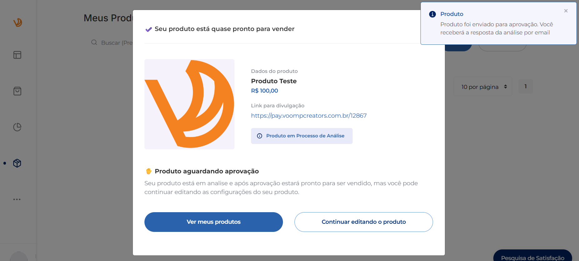 Pronto, seu produto foi cadastrado na plataforma e passará por aprovação do time Voomp!